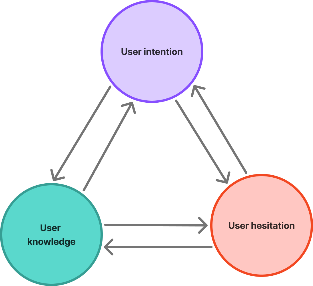 Understanding the interdependency between user intention, knowledge, hesitation