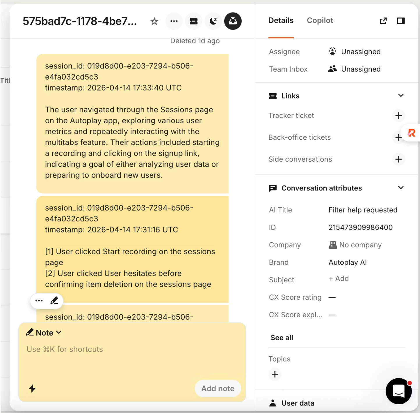 Once the session is linked, Autoplay writes product activity into the conversation as internal notes.